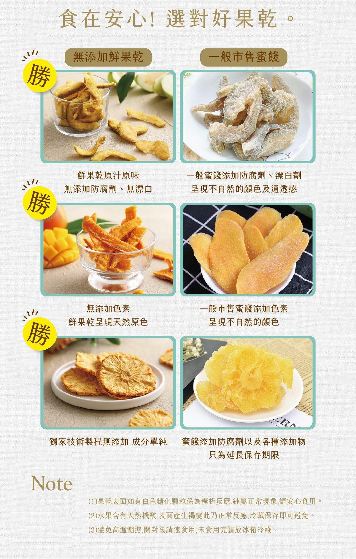 ▲果乾無添加色素、漂白,水果含有天然機酸,生產後隨著時間會慢慢褐變,顏色變深,是正常的現象哦▲