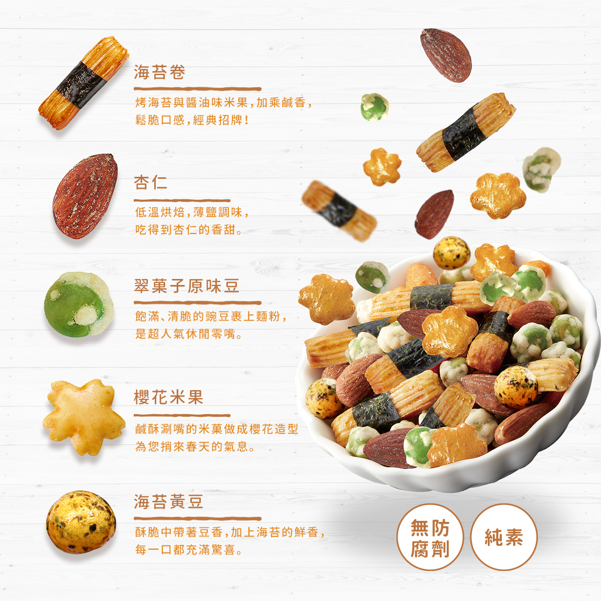 內容物: 杏仁、海苔卷、翠菓子原味豆、櫻花米果、海苔黃豆