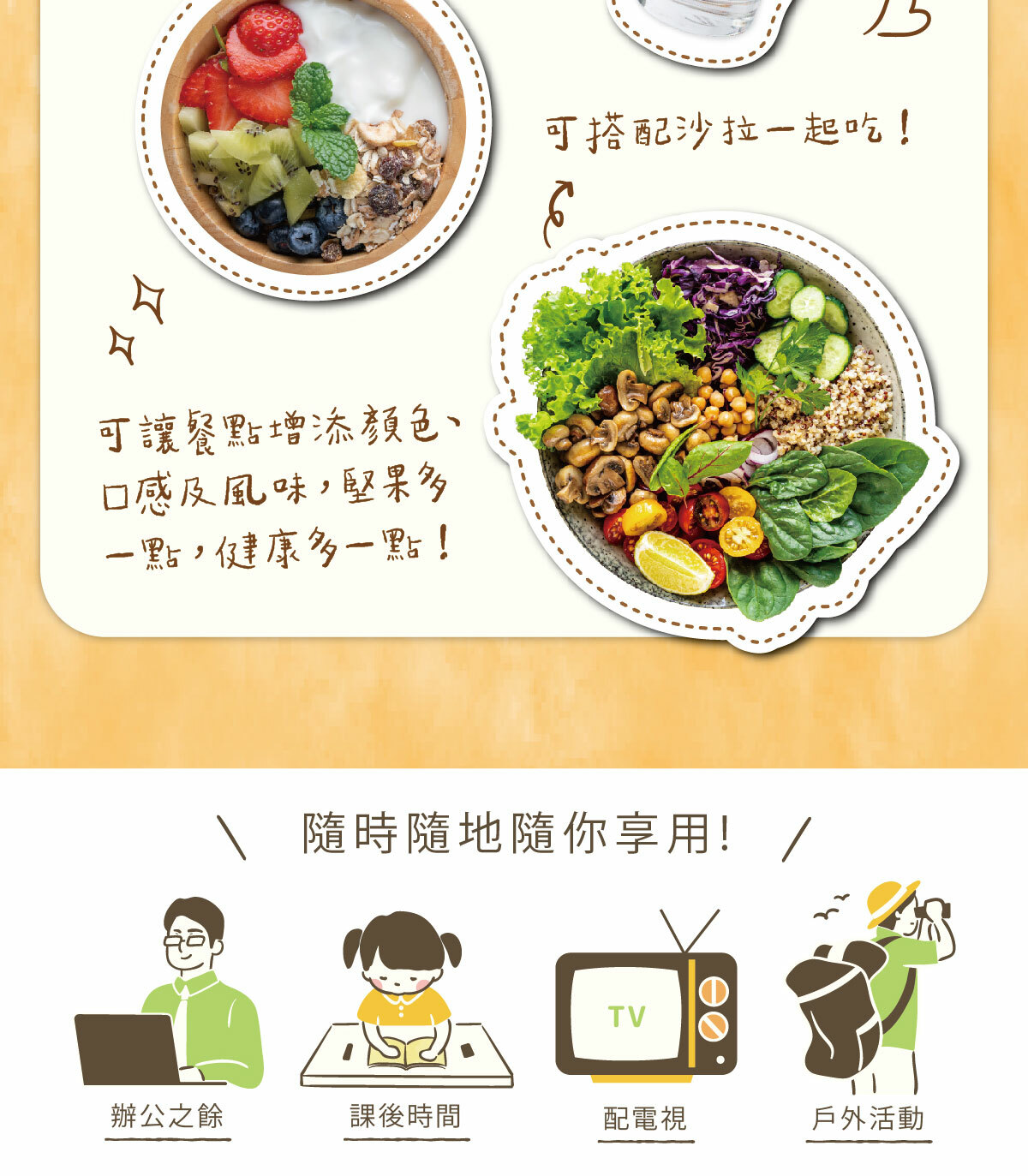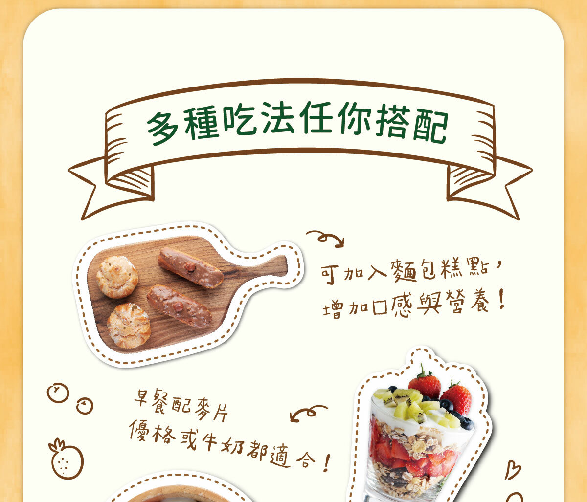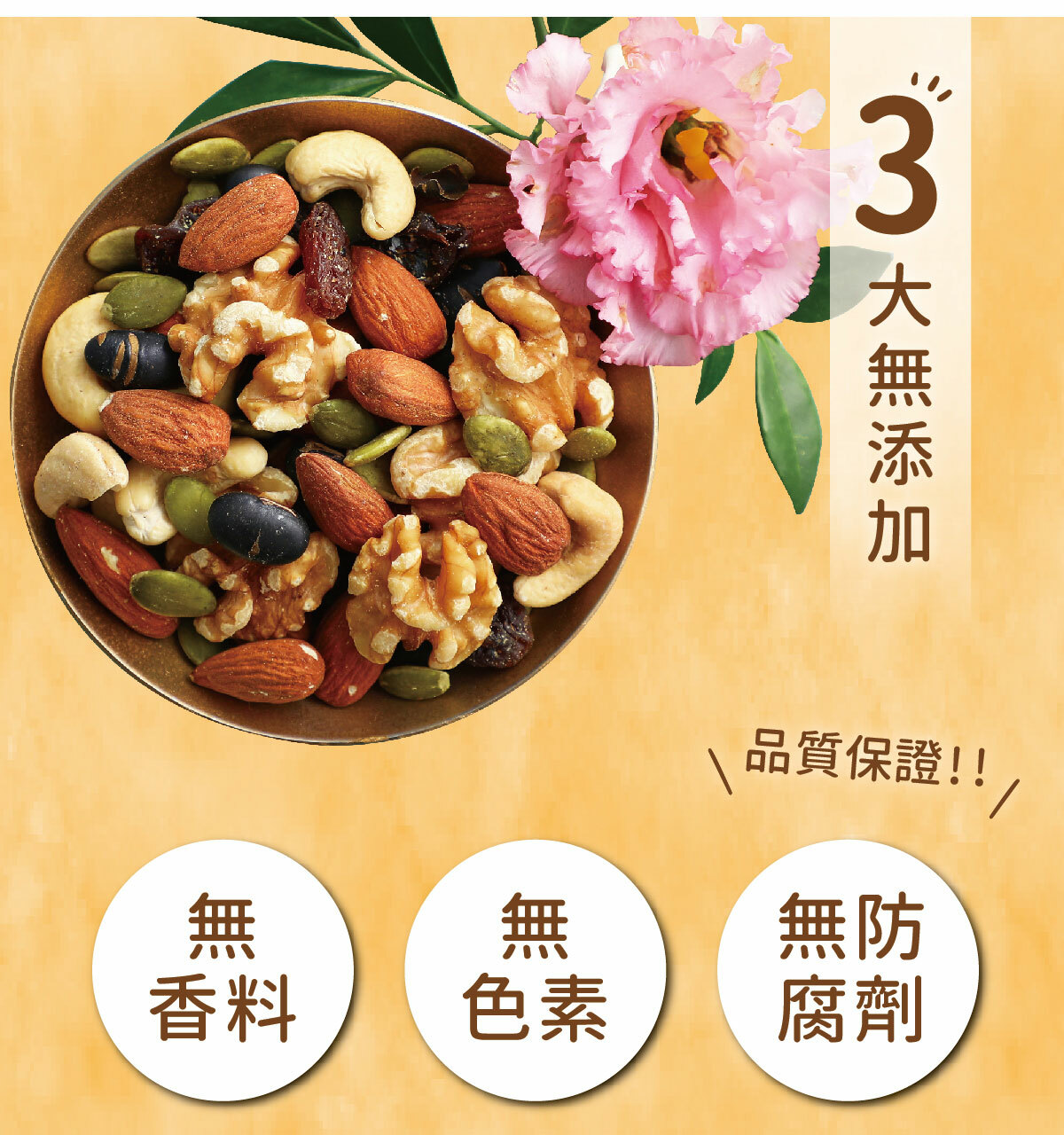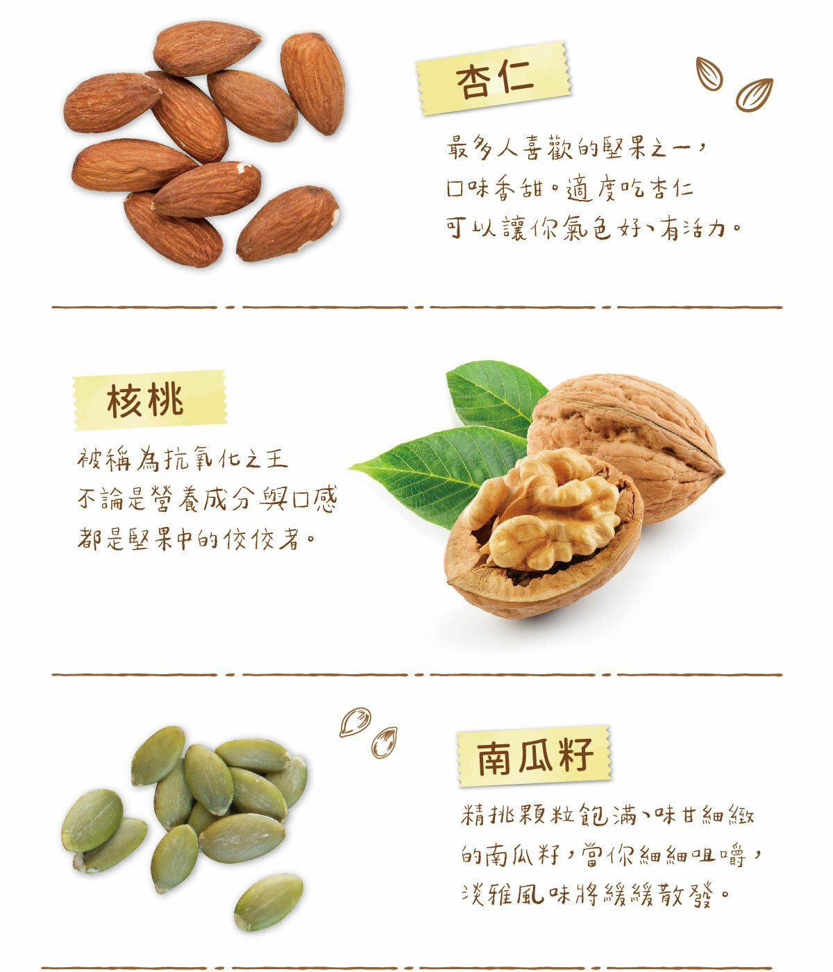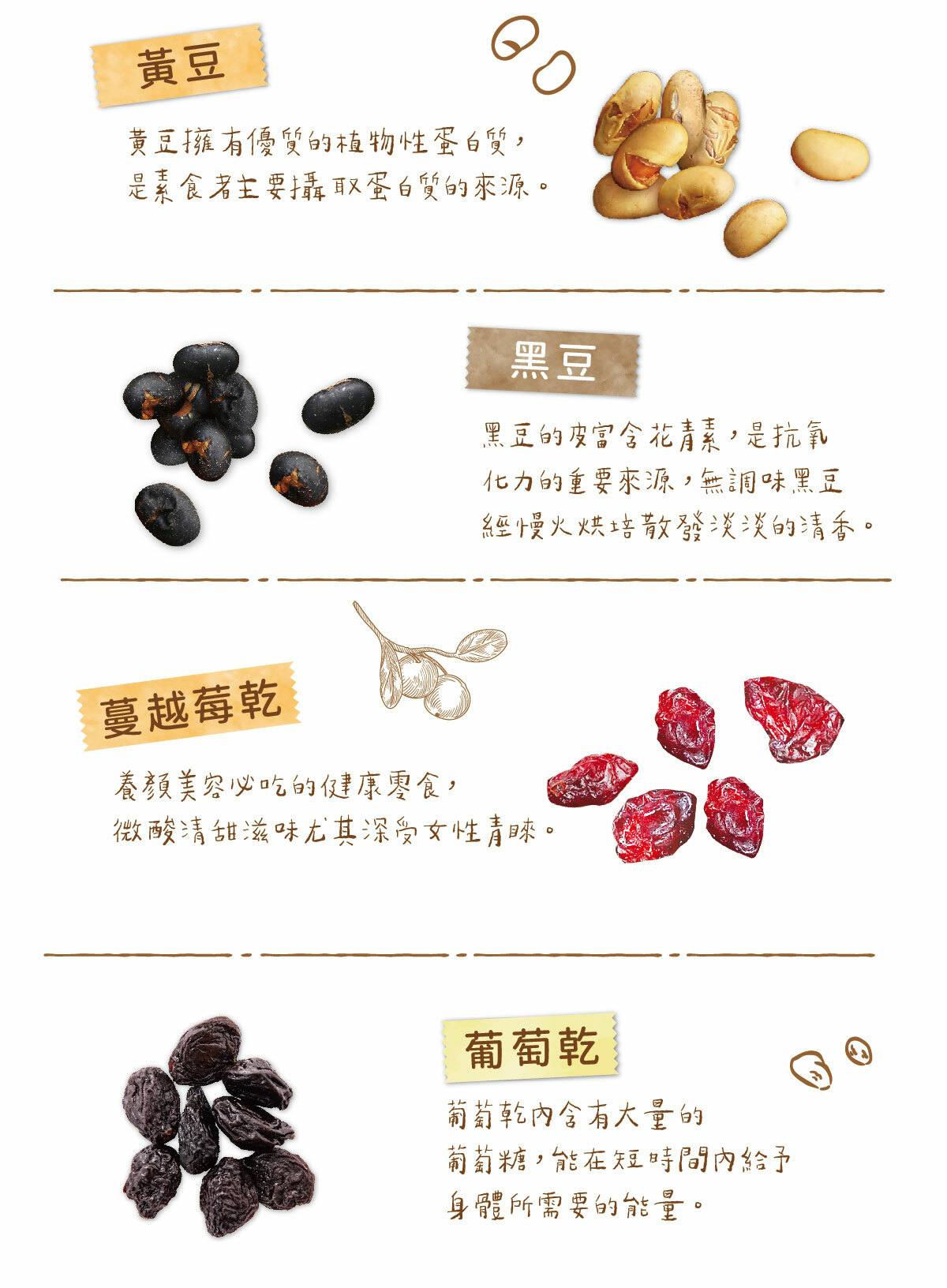 內容物:杏仁、核桃、蔓越莓乾、葡萄乾、南瓜籽、黃豆、黑豆