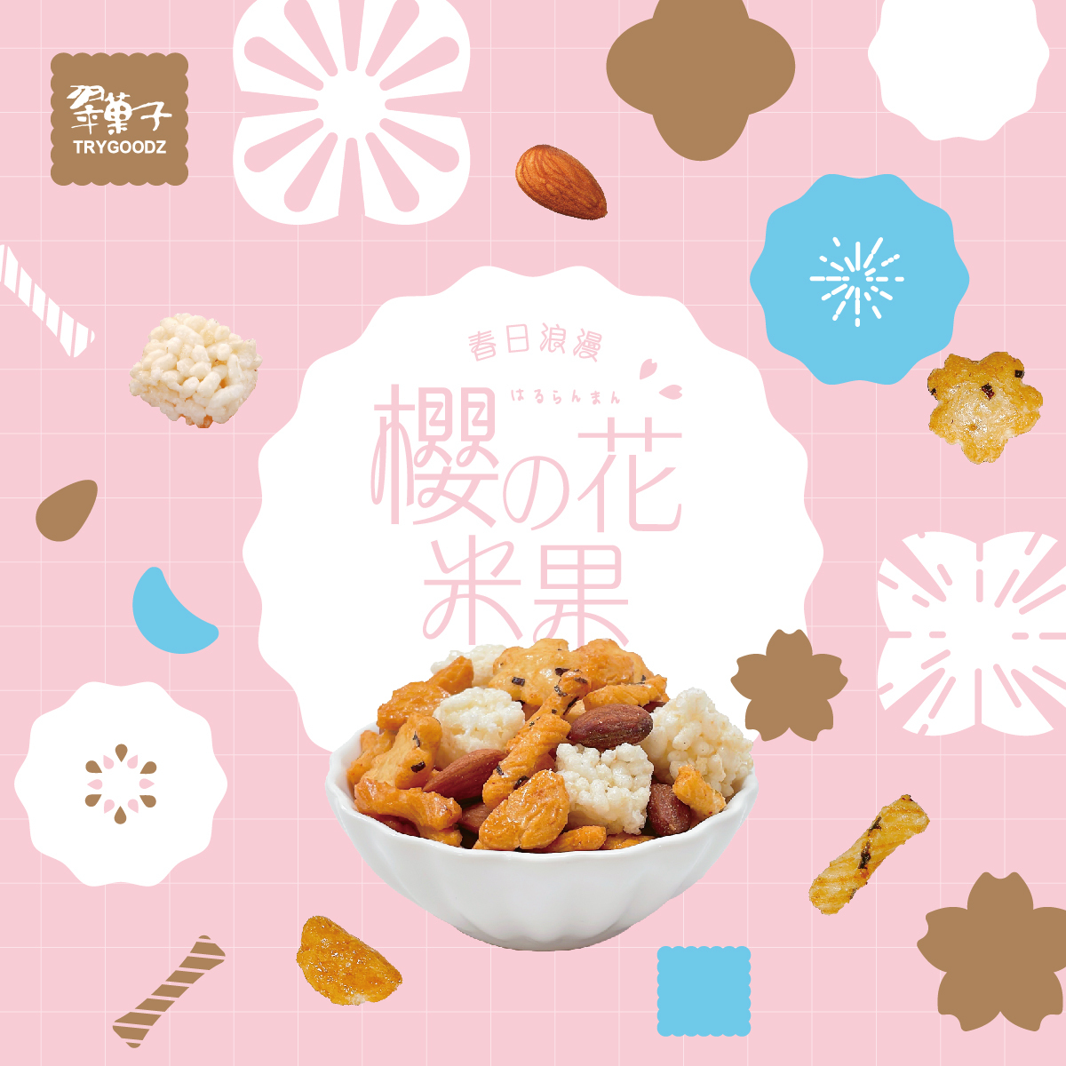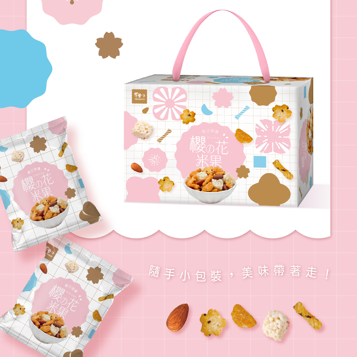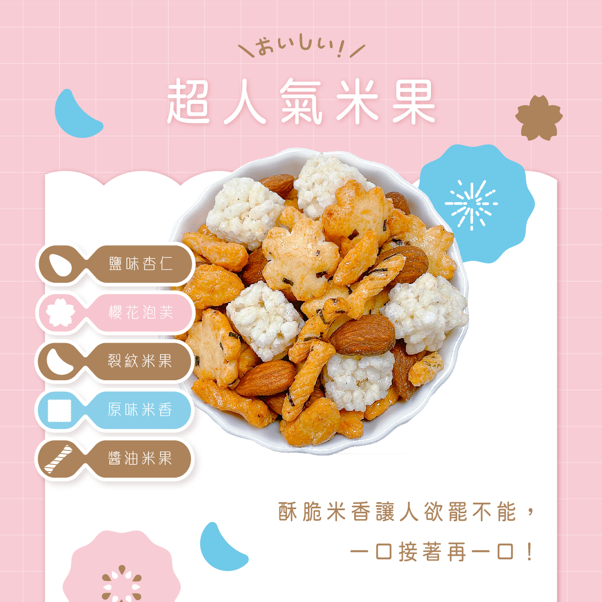 內容物:鹽味杏仁、櫻花泡芙、裂紋米果、原味米香、醬油米果